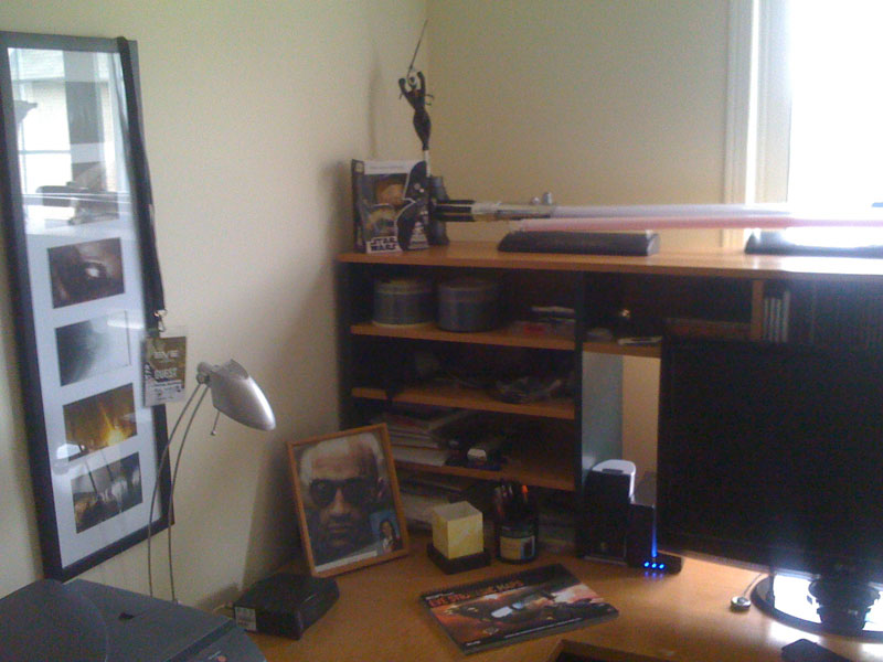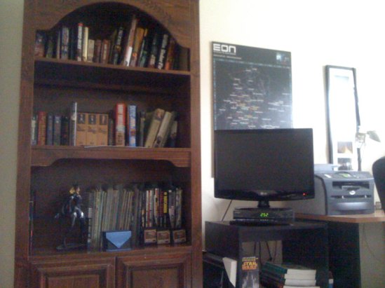 They say you can learn a lot about a person by the way they keep their desk. So what do my desk items tell you about me? Collectible lightsabers on top, Serenity Steele’s EVE Strategic Mapbook at hand, DLink DNS-321 NAS, DIR-655 Router hidden behind, self portrait with smaller, personal picture, LG W2753W monitor. I’ll let you come to your own opinions and observations.